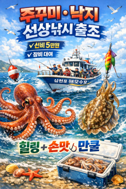 안녕 하십니까.해모수호 김선장입니다 ^^야간낙지.주꾸미 선비 5만원 식사 (김밥.라면 음료 커피 생수지급)수요일부터 쭉 빈자리 많습니다,※ 바로 예약하기 > 클릭 http://haemosu.sunsang24.com 낙지" 요즘 조사님들 모두들 손맛 찐하게 보고 충분히먹거리하고 마감 하고 있습니다.2026년 1월. 알주꾸미 물때 날씨 좋은날 출조 합니다.문의 주세요. 조사님들 친구,연인 ,가족과 야간낙지 낚시로 힐링 해보세요.내만권 중원도권 으로 구석 구석 다녀 보겠습니다. ※ 삼천포 해모수호 선상낚시와 함께하는 바다낚시의 짜릿한 손맛!탁 트인 남해 바다, 시원한 바닷바람을 맞으며 즐기는 진짜 낚시의 매력!**삼천포 팔포항 출항 주꾸미.낙지 전문 낚시배 ‘해모수호’**에서 여러분을 짜릿한 바다로 초대합니다.♧ 이런 분들께 추천드립니다!※ 왕초보부터 프로 낚시꾼까지 누구나 환영※ 돌문어, 주꾸미, 갑오징어,낙지 ,참돔 등 계절별 어종 다양※ 가족·연인·친구.직장동로들과 특별한 하루를 보내고 싶은 분※ 인생샷과 손맛을 동시에 즐기고 싶은 분※ 해모수호만의 특별한 혜택※ 넓고 깨끗한 선실 ☕김밥지급 / 한강라면, 커피, 음료 무제한 제공※ 낚시 장비 & 구명조끼 무료 대여몸만 오셔도 낚시 가능 합니다. ※ 청결한 화장실 완비※ 친절한 선장님의 포인트 안내 + 초보자 강의까지!※ 출조 정보출항지: 경남 사천시 팔포항운항 시간:오전 출조: 도착07:00 출발 07시30~15:00야간 출조: 18:00~01:00예약 방법:1. 해모수호 공식 웹사이트에서 일정 확인2. 입금 후 예약 확정 (수협 2020‑4388‑8170 김정연)3. 당일 30분 전 항구 도착!※ 예약 및 문의전화/문자: 010‑8538‑4272 (선장 직통)홈페이지: http://haemosu.sunsang24.com네이버 밴드: ‘삼천포 해모수호’ 검색! https://band.us/@1242 네이버블러그 https://blog.naver.com/wjdgml00178※ 바다 위에서 느끼는 자유와 짜릿한 손맛!지금 해모수호와 함께 최고의 낚시 여행을 시작해보세요! === 삼천포 해모수호 예약안내 ===예약문의 : 010-8538-4272오시는길 : 사천시 동금동579-7번지 (수협냉동 창고밑 해모수호)홈페이지 : http://haemosu.sunsang24.com/
